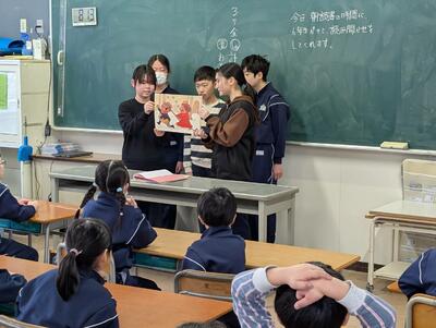 6年生が卒業する前に学校への感謝を伝えるプロジェクトとして朝学習の読み聞かせを行いました。各学年に分かれてそれぞれの学年に合った本を選択し、気持ちを込めて読み聞かせをしました。在校生は、6年生が読む本を少し寂しそうな表情で聞いていました。子供たちの視線は6年生と本に釘付けでした。