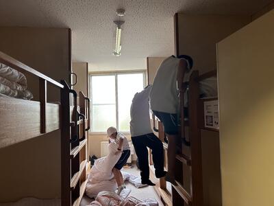 美味しいお昼ご飯を食べて時間がたっぷり余ったので、体育館でドッジボールをして遊びました。ここまでは、順調です。と思った矢先、雷がなり雨が降り出しました。バケツをひっくり返したような大雨です。ベッドメイクをしながら只今雨宿り中です。