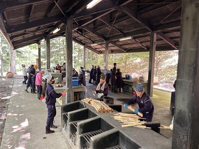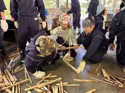 かまどの準備と野菜切り、米とぎが順調に進み、火おこし体験に挑戦中です。悪戦苦闘しております。